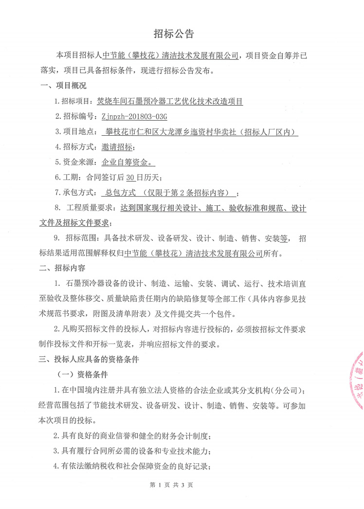 焚燒車間石墨預(yù)冷器工藝優(yōu)化技術(shù)改造項目招標公告