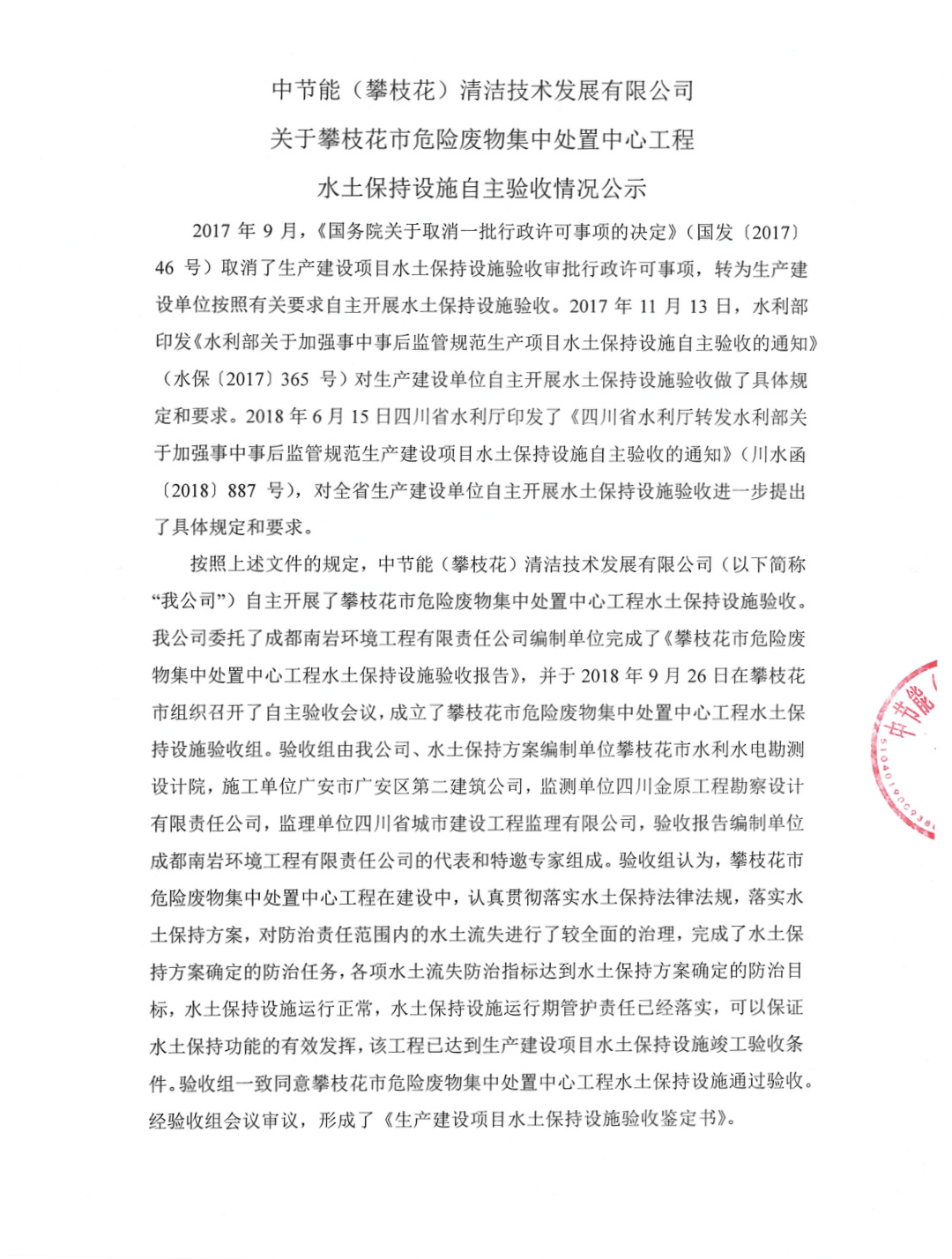 攀枝花市危險廢物集中處置中心工程水土保持設(shè)施自主驗收情況公示
